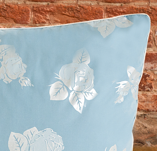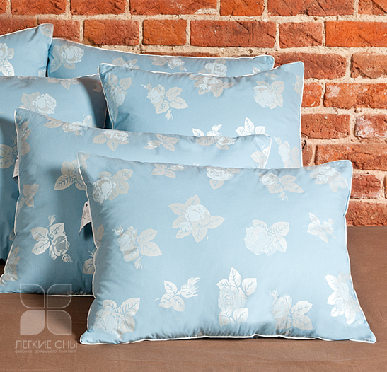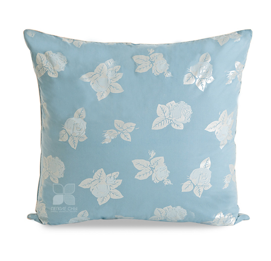 В качестве наполнителя данной подушки используется полупух 1 категории. Она выполнена из пуходержащего хлопкового тика голубого цвета с рисунком в виде розы, по краю подушки отделка белым кантом.